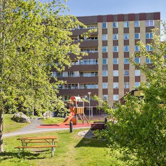 Bostad Hall: Security door, light floor and light wallpaper Kitchenette: Light cupboards with a wood-coloured edge, hob, combined fridge/freezer, grey flooring and white tiles above the sink Living room: Parquet floor, walls papered in light tones Bedroom: Light wallpaper, light linoleum floor, access to balcony Bathroom/Shower room: Light wall covering with a floral pattern, blue vinyl floor, bathtub Balcony or patio: Yes Other spaces Storage: Yes, in the basement Laundry room: Yes, in the courtyard Bicycle storage: Yes, on the ground flo...
