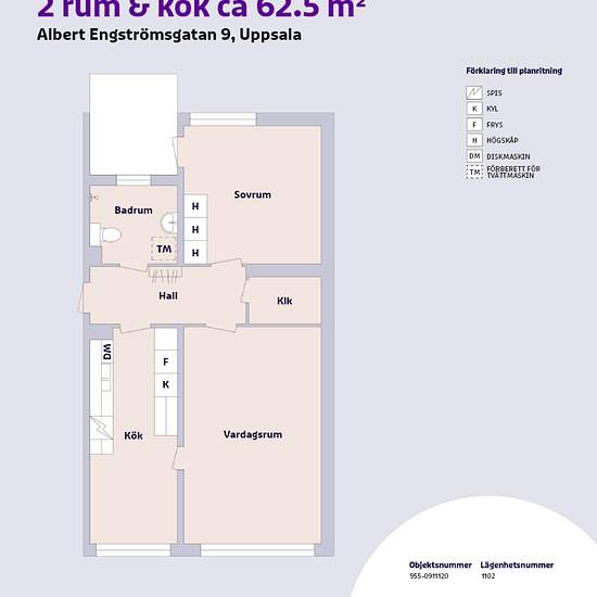 Welcome to a bright and smartly planned apartment with 2 rooms and a kitchen and a balcony! Hall with plenty of space for coats and storage. Living room with oak parquet, large windows and nice natural light. Kitchen with room for a dining table and equipped with fridge, freezer, oven, stove, extractor hood and dishwasher. Storage possibilities are good with an associated storage room in the stairwell right next to the apartment and a walk-in closet. The fully tiled bathroom is equipped with a sink, toilet and shower and is prepared for a wa...
