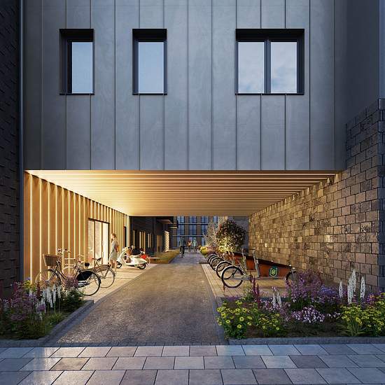 The apartment is characterized by light-colored walls, parquet flooring, and natural stone windowsills. The hallway has tiled flooring. The kitchen is equipped with a combined fridge/freezer, microwave, dishwasher, built-in induction cooktop, and a separate convection oven. The bathroom features a combined washer/dryer, glass shower walls, a mirrored cabinet, and a vanity unit. The bathroom walls are fully tiled, and the floor is covered with tiles. The apartment has a storage room on the fourth floor. Residents have access to an electri...