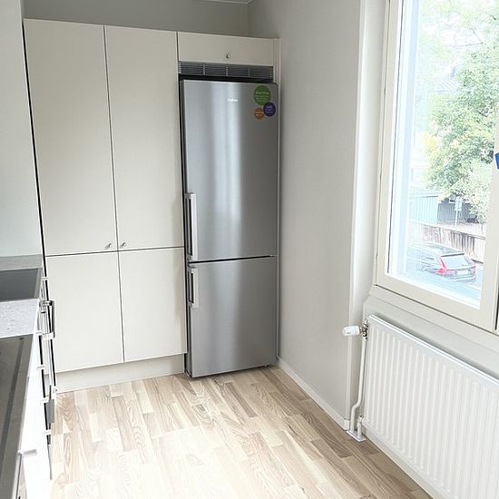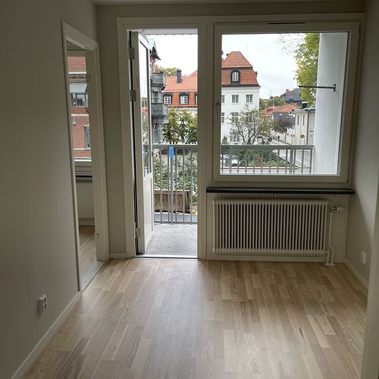 We are renting out a newly renovated one-bedroom apartment in the city center on an ongoing basis. It is 43 square meters plus a balcony of three square meters. The apartment has a lovely view and is one floor up. Rented unfurnished. The rent includes everything except home insurance. Service fee for the tenant: 767