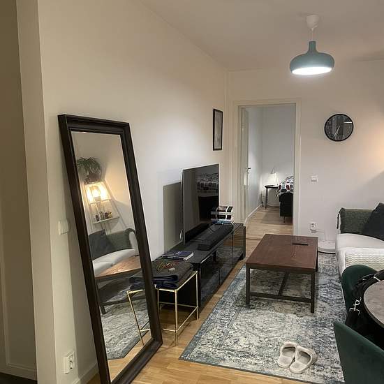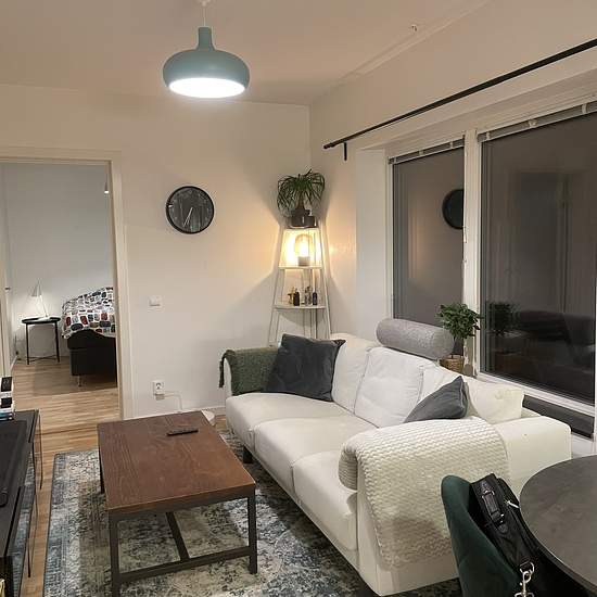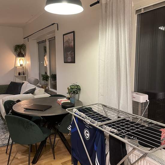- Open floor plan. - Fully furnished with plenty of storage space. - Modern, fully equipped kitchen. - Washing machine. - Nice neighbors and pleasant natural surroundings. - Patio facing greenery and a sledding hill! - Within walking distance to Johannelund subway and close to Vällingby Centre; frequent buses. - Electricity and broadband included. - Smart TV. Renting out my apartment because I'm moving in with my partner. Looking for a responsible person who is pet-free and a non-smoker. Service fee for tenant: 668