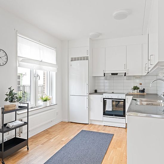 Hyresrabatt – totalt upp till 27.000 kr första året 3.000 kr rabatt/månad under månaderna 1–6 1.500 kr rabatt/månad under månaderna 7–12 Ordinarie hyra visas i annonsen rymlig tvårummare med balkong och fint gavelläge. Modernt kök från Vedum med vita luckor, grå laminatbänkskiva, rostfri diskbänk och vitt kakel ovan arbetsbänk. Vita vitvaror från Electrolux; diskmaskin, glaskeramikhäll och kyl/frys. Genomgående mattlackerad ekparkett och vitmålade väggar. Sovrum med ingång via skjutdörrar och helkaklat badrum med dusch. Gemensam tvättstuga...