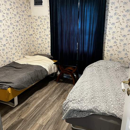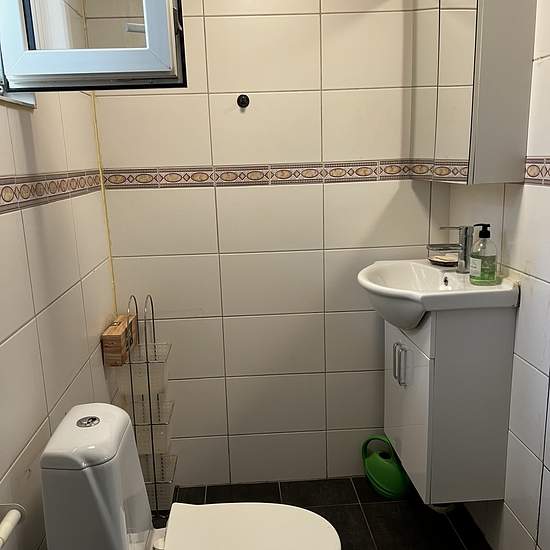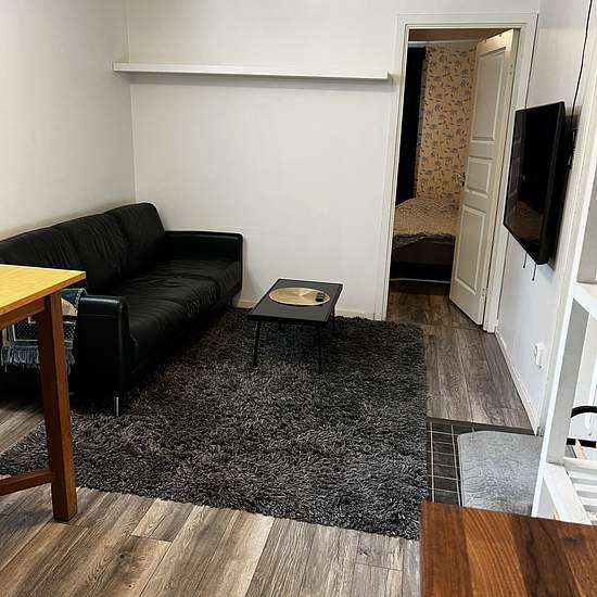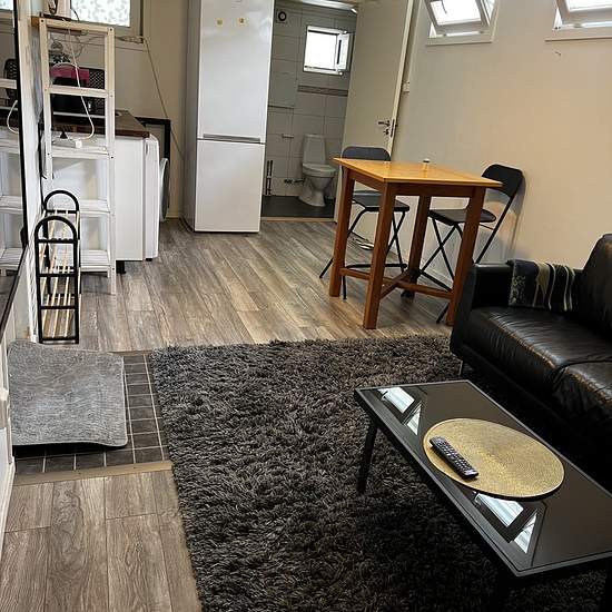 Kallhäll, 2 rooms. Part of a house used as a guest cottage. Private entrance. Long-term rental for a maximum of two people. Furnished: 1 bedroom and 1 TV room; the kitchen is in the TV room. Good private bathroom. The unit includes two beds, a sofa, TV, washing machine and tumble dryer, a dining table with two chairs, and a small stove. Electricity, water and trash are included. No private parking, but there are several free parking spaces nearby. Close to the bus stop and 7 minutes to the commuter train. Service fee for the tenant: 672