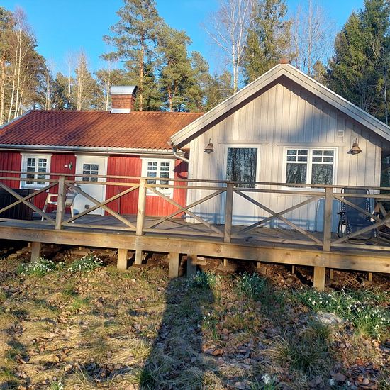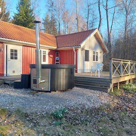 A newly renovated residence is located privately with beautiful nature around, near a lake, nice view. Stove old cast iron stove, open fireplace, Cozy house, good heating system, large terrace, wood-fired hot tub, close to Mellerud center about 2 km. Service charge for tenant: 356