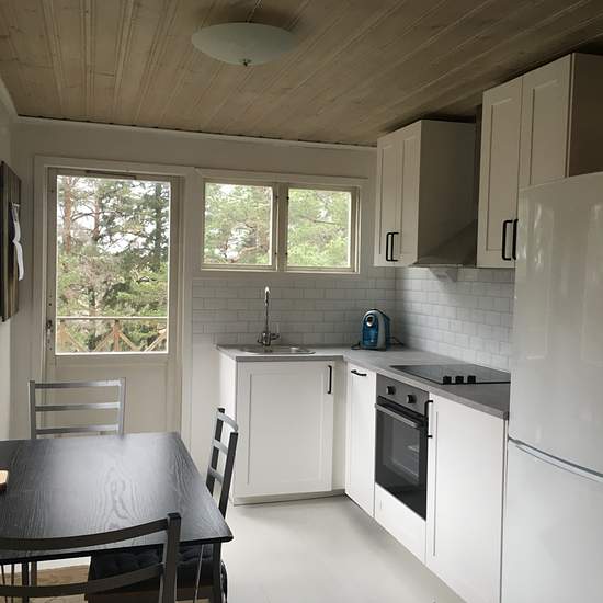 The cottage is located in Stenhamra, on a large plot with parking possibilities. Patio around the house facing southwest; the cottage is situated up high and is not overlooked. 48 sq.m., with a separate bedroom. Wood-burning stove and air-source heat pump. There is a small walk-in closet/storage space in the cottage. Newly renovated kitchen and bathroom, IKEA kitchen with washing machine, induction hob, refrigerator and freezer. Bathroom with tiles and a Cinderella incinerating toilet. Since there is no municipal water supply to the cottage...