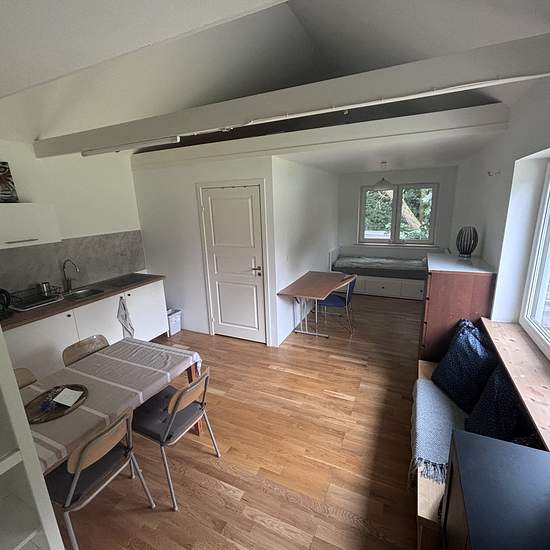 I rent a 40-square-meter house with everything you need. There is a bedroom and a large living room with a kitchenette and dining area. There is an entrance hall and a bathroom with a shower, washing machine and tumble dryer. Furniture is included in the price. There is a spot in front of the house with a table where you can drink coffee or have breakfast. Parking is 150 meters away. It is nestled among trees in the quiet Alstad area. The price includes heating, water, internet and parking. Electricity is paid separately. Service fee for ten...