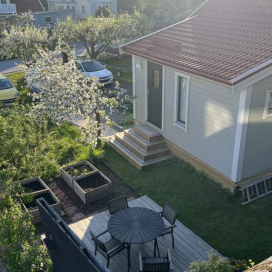 Huset ligger i ett mycket trevligt och grönt villa kvarter. Bara 25 minuter till Stockholm City med kollektivtrafik! Det är ett nyrenoverat hus med modern standard. Utanför huset finns en veranda med möjlighet att sola och äta middag. Huset är placerat i vår trädgård, men ligger separat och privat. Det är nära till sjön, naturen och skärgården. Bara några minuters promenad från huset finns en park och fina strövområden. Det finns ett sovrum, ett rum med kombinerat kök och vardagsrum samt ett badrum. Det finns också ett sovloft för en vux...