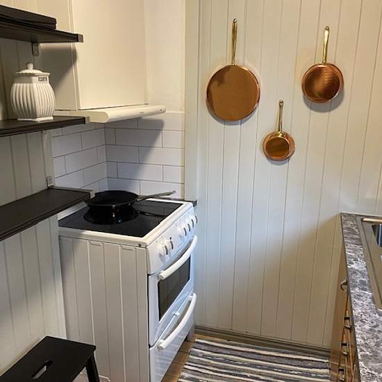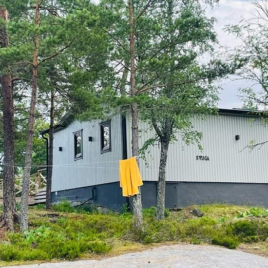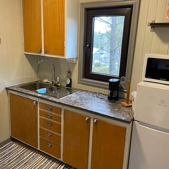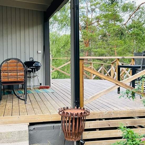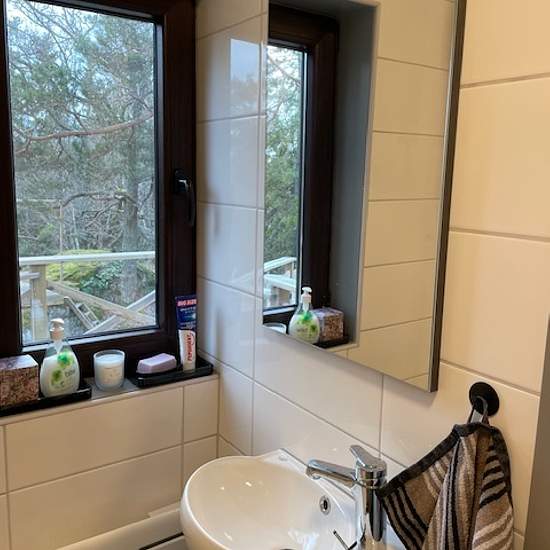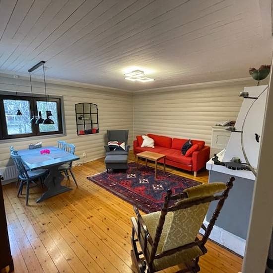 Cottage in a private location near the lake. Newly and fully renovated, large outdoor terrace, and private setting on a forest lot. Close to bus and to Stockholm City. Washing machine in another building 30 meters away. Service fee for tenant: 470.