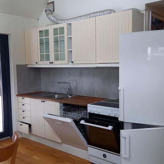 It is a house with a porch, and on the ground floor there is a kitchen with a dining table, a bathroom with a shower, two rooms, and upstairs there is one room. Service fee for the tenant: 717.