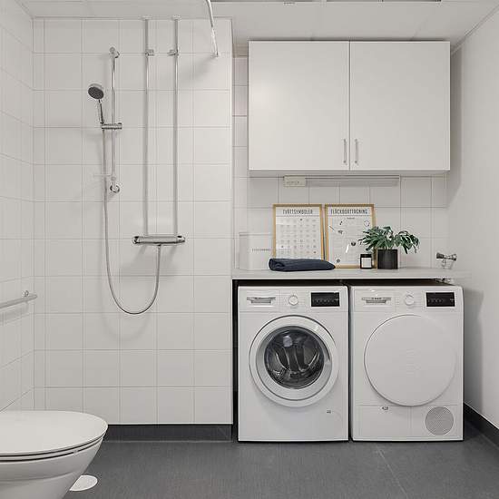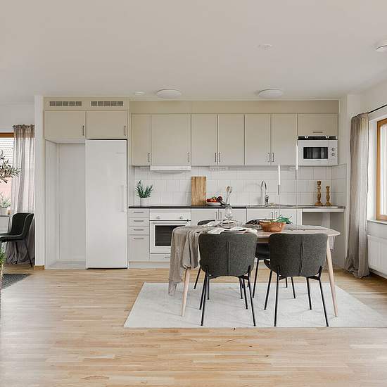 Tre rum och kök fördelat på 75 kvm med öppen planlösning mellan kök och vardagsrum, fina sällskapsytor och generös balkong/uteplats. Stort härligt sovrum och extra sovrum eller arbetsrum. Rymlig hall med plats för mindre möblering och ett stort badrum med tvättmaskin och torktumlare. Planlösning är en exempelbild. Variationer och spegelvända lägenheter kan förekomma.