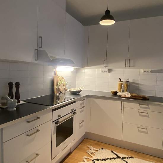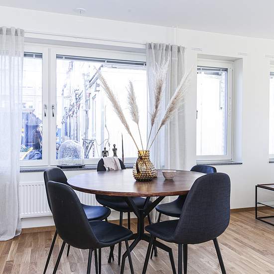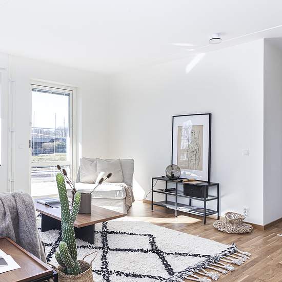 The block consists of 110 newly built rental apartments of 1–4 rooms and kitchen (1–4 ROK), in sizes 34–89 sqm. The four buildings in the block have 4–5 storeys and surround a sheltered courtyard. Here you live comfortably close to pleasant walking paths and nature, just under 2 km south of central Ängelholm. The apartments are bright, well planned and designed with functional layouts in a modern style. The walls are painted white and the floors have continuous parquet, while the entrance is fitted with gray tiles. The kitchens are of high ...