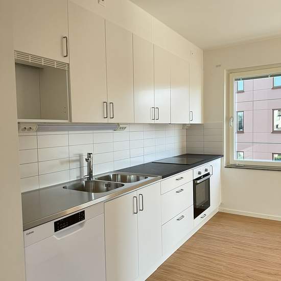 Offered here is a nice, well-laid-out newly built rental apartment with a south-facing balcony of 12 sqm. On the floor plan you can see which building and where in the building the apartment is located. The kitchen has sleek white doors and drawers and is equipped with a dishwasher, hob, modern appliances, a white tiled splashback and space for a microwave. The bathroom has black floor tiles, white wall tiles and a bathroom cabinet with lighting. There is also a washing machine and tumble dryer. There are storage rooms in the attic or in t...