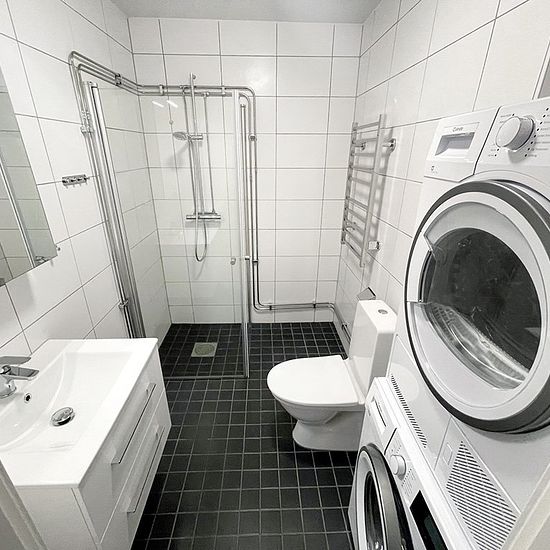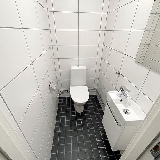 Renovated 2-bedroom apartment with balcony. In this home, you are welcomed by a functional hallway with plenty of storage in the form of a walk-in closet. Adjacent to the hallway, you reach the bathroom with tiled walls and floor tiles, featuring a shower, washing machine, and tumble dryer. Additionally, there is a practical guest toilet. Further on, you reach the spacious kitchen with white smooth cabinets and stainless steel appliances such as a dishwasher and built-in microwave. The apartment has a pleasant layout and offers generous spac...