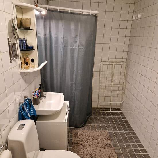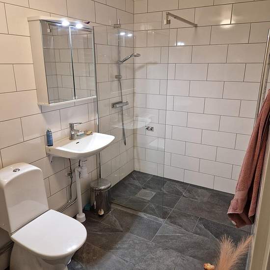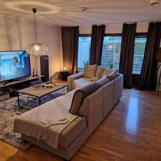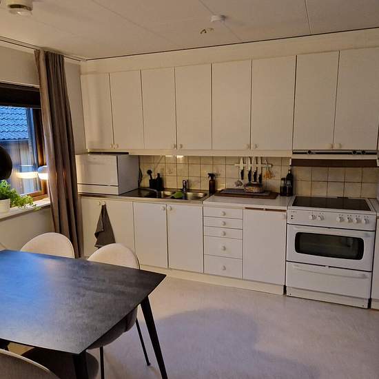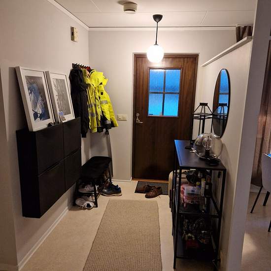 Entrance to the apartment through its own exterior door leading into a large hallway with good storage options. The kitchen and living room are adjacent to each other. In the other half of the apartment there are two bedrooms separated by a bathroom between them. The apartment is very spacious, has large windows and offers a lovely atmosphere. It has an open-plan layout and good room division. Most of the rooms have windows facing south, which creates a beautiful light in the apartment. The apartment is located on the ground floor and has i...