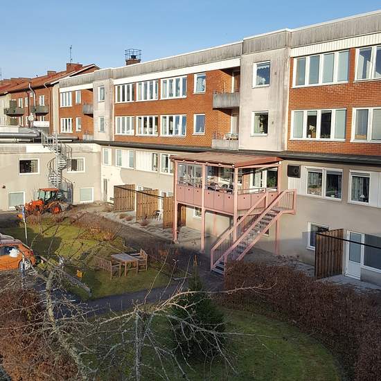 Södra vägen 13 A-B is located in the heart of central Bjärnum. Here you live a stone's throw from the bus and train station, offering good commuting options. When you step out of the apartment you are in the town center, close to shops, the health center, a pharmacy and a bank. You also live near a sports facility and a swimming pool. The apartments are well planned and most of them have a balcony. The buildings have a cozy inner courtyard with a playground. Household electricity is not included.