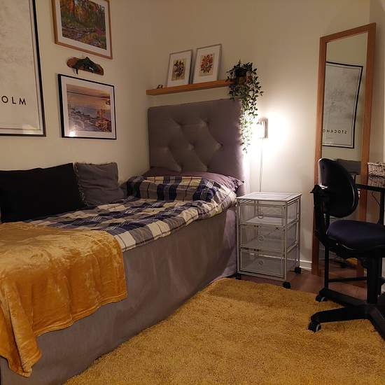 Small but bright and fresh, furnished room in Bromma with a well-appointed wardrobe, comfortable bed with a spring mattress, desk, etc., shared kitchen and bathroom in a three-room apartment in a low-rise building — laundry room, pleasant courtyard with barbecue area. Five minutes to Islandstorget metro / bus 113 to Sundbyberg / Solna, 24 minutes to T‑Centralen (Central Station). Three minutes’ walk to the local centre with a grocery store, library, pharmacy, café, etc. Quiet area with lovely walking paths along the water, rocky shore and be...