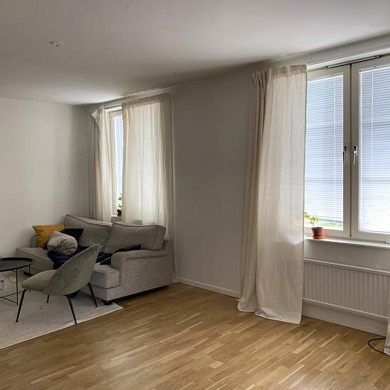 Pleasant apartment with consistently light walls and nice parquet floors. The entire apartment has been renovated while retaining its older charm. The kitchen is large and airy and has a separate fridge and freezer as well as a dishwasher. There is one larger bedroom and one slightly smaller. A large walk-in closet in the hall. The bathroom has been renovated with white tiles and a gray tiled floor. There is a bathtub and provisions for a washing machine and dryer. In the pleasant inner courtyard you can enjoy the sunshine.