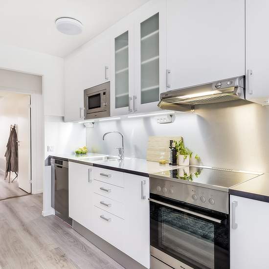 Welcome to a renovated 3-room apartment with consistently high, modern standards. HALL Welcoming entrance hall with black entrance flooring, white walls and wood laminate flooring. KITCHEN Modern kitchen with stainless steel appliances, anthracite gray countertops and a ceramic glass hob. The cabinet doors are white with sleek steel handles. The kitchen is equipped with two fridge/freezer units, oven and hob, extractor fan, as well as dishwasher and integrated microwave. BATHROOM The apartment has one bright fully tiled bathroom equipped ...