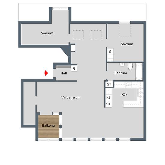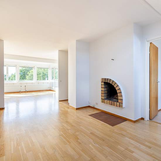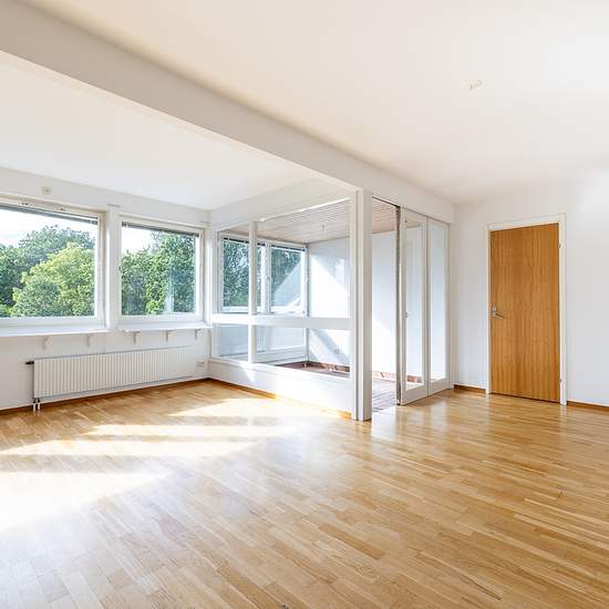 Bo Bra, three-room apartment with fireplace This larger three-room apartment features an open floor plan with a kitchen equipped with white cabinets, green tiles and a dishwasher, as well as a dining area with parquet flooring and west-facing windows. The bathroom has a bathtub, washing machine and tumble dryer, while the living room is graced by a fireplace, sloping ceiling and large windows. Two bedrooms provide storage with wardrobes and natural light from the east and west. A built-in balcony and a walk-in closet complete the apartment. ...