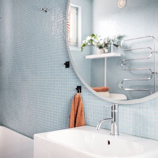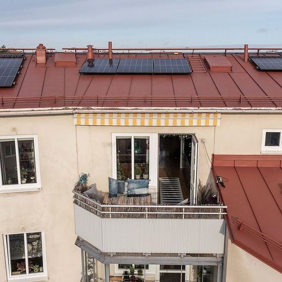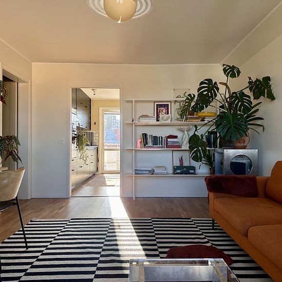 Wake up above the rooftops of southern Stockholm. "Lövtaket" is located on the 5th floor of a well-maintained building in Hägersten - top floor, lots of light, and the kind of quiet you only get when there's no one above you. The views over the courtyard are genuinely lovely. The kitchen has a strong personality: yellow walls, dark cabinetry and countertops, subway tiles, double oven - and a door out to a big private balcony. The living room leans into colour with rust-orange sofas, bold black-and-white rugs, and a few oversized plants doing...