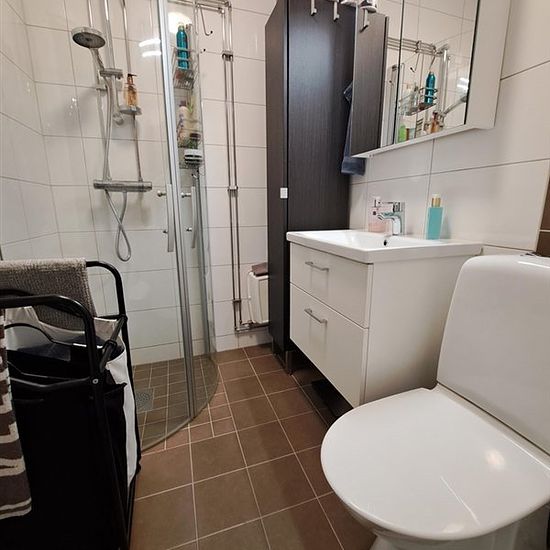 This apartment is 63 square meters and is located on the 3rd floor. Monthly rent is 10,600 kronor; water, cable TV, and heating are included in the rent.