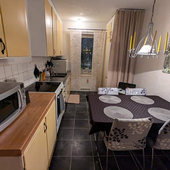 The residence is located on a cul-de-sac. Below my place there is a grassy area with berry bushes, rhubarb, various herbs and a barbecue area with furniture. The laundry room has four machines, a drying cabinet and tumble dryers that you can book and use alone. Otherwise it is fine to book just two machines. The laundry room is located 1 minute from my apartment. In Kärrtorp there are several restaurants and cafés and several playgrounds. The large playground is 2 minutes from my apartment. The square and the subway are 2 minutes from me. On...