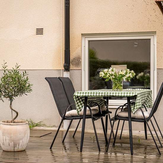Newly renovated 3-room apartment with its own patio. Unfurnished; furnished option available. Close to town and shops. Service fee for tenant: 519