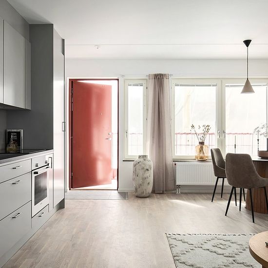 Residence In central Knivsta, just 24 minutes from Stockholm, you will find this well-planned apartment. Modernly designed with an open floor plan between the kitchen and living room. Throughout, white-pigmented oak parquet flooring and light walls. Light gray kitchen from Vedum equipped with dishwasher, fridge, freezer, oven, and induction cooktop. The bathroom includes a shower as well as a washing machine and dryer. There is also access to a shared laundry room. The property is equipped with solar panels and geothermal heating. Included ...