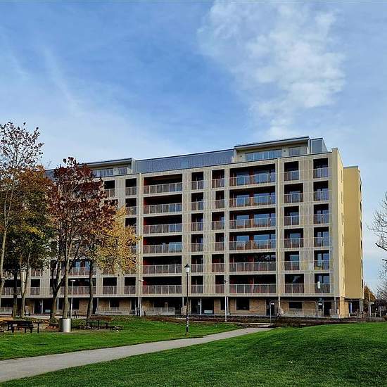 Nice 3-room apartment on the ground floor with two paved outdoor patios. Open-plan layout between the kitchen and living room. Continuous floor plan with large windows for maximum light. Tiled bathroom with a shower with folding doors; an extra guest toilet is located in the hallway. A storage room belonging to the apartment is in the attic and the laundry room is located on the ground floor; there is an elevator. Good parking options. Close to school, playground, sports field, Puls Arena and a grocery store. Good public transport via regio...