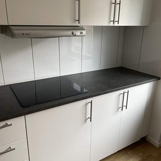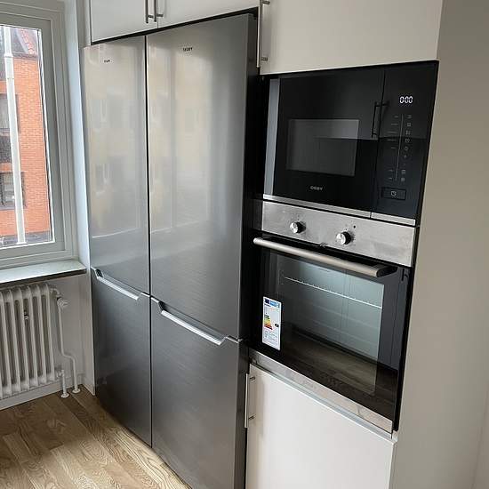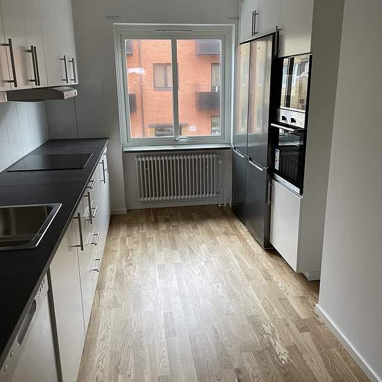 Welcome to this lovely apartment that was completely renovated in 2024. The walls in all rooms are painted white and the floors have oak parquet. The kitchen has white cabinet fronts and a gray countertop, with an induction hob, built-in convection oven, full-height fridge and freezer, microwave, and dishwasher. The bathroom has white-tiled walls and a gray tiled floor. The apartment is on the first floor. Cozy garden in the back. The photos are borrowed from a previously renovated apartment. Apartment storage and a laundry room are in the b...