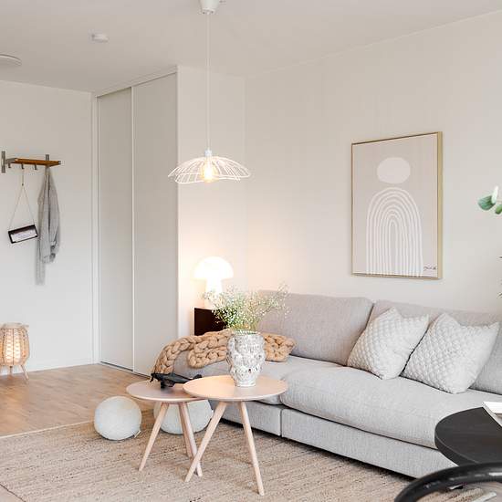 Lägenheten är nybyggd och är smakfullt inredd med trägolv av vit mattlackad ek och ljusmålade väggar. Det här är ett smart planerat boende med all standard som behövs för ett bekvämt boende. Köken är vackert skogsgröna och utrustade med spishäll, ugn, mikro, diskmaskin och kombinerad kyl/frys. Badrummen har vitt kakel, ljusgrå klinker och en kommod i sandbeige kulör. I fastigheten finns en välutrustad tvättstuga med tvättmaskin, torktumlare, torkskåp, mangel och diskbänk. I bottenvåningen finns också ett generöst cykelrum med verkstadsplats....