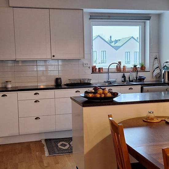 A cozy apartment (78 m², 2 bedrooms and a kitchen) in a very nice and quiet area in Steninge, Märsta. The apartment has an open-plan layout between the living room, dining area and kitchen, complemented by beautiful oak parquet with underfloor heating that provides a pleasant and warm feeling during the cold months. The apartment opens up with windows facing two directions, creating both light and a sense of space. The sleek kitchen has white cabinet doors and fronts, good work surfaces and a generous kitchen island. It is equipped with sta...