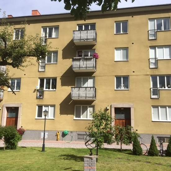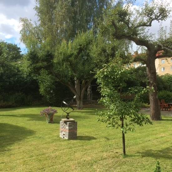 An apartment with a little extra charm in an old style, with wooden floors and a large, furnishable hall with a working fireplace. The living room has a large bay window. The apartment has windows on three sides and two balconies, one regular and one French. The kitchen has a large fridge and a large freezer as well as a dishwasher. The property has a large, leafy garden with several seating areas and fruit trees. The location is perfect! Quiet and secluded but within walking distance of the city, grocery stores and bus and tram. The apart...
