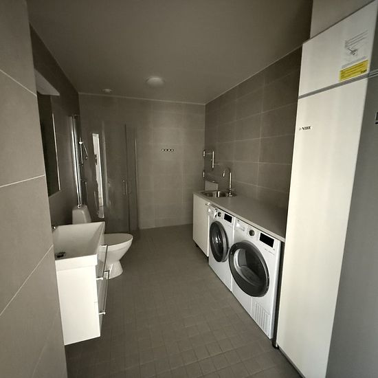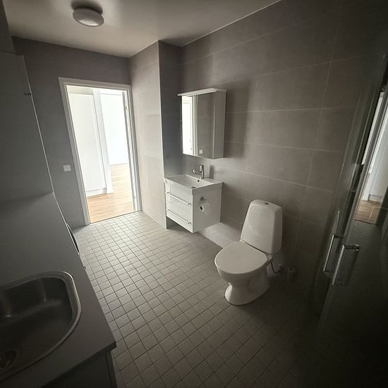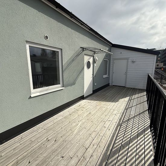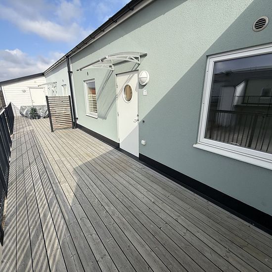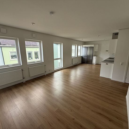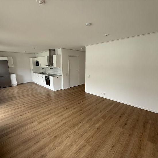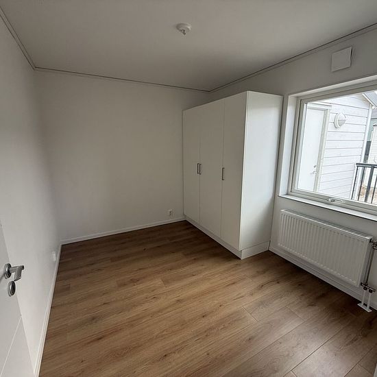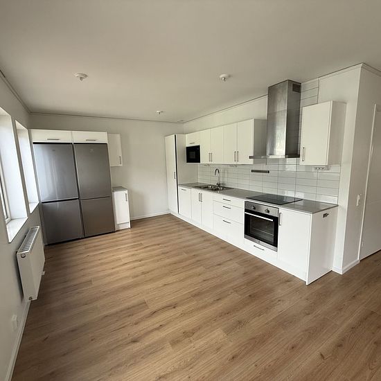 Modern trerumslägenhet med radhuskänsla, förråd och egen parkering Välkommen till denna mycket fräscha och välplanerade bostad från 2022 med modern standard, fina materialval och en trivsam radhuskänsla. Lägenheten erbjuder ett bekvämt boende en våning med öppen planlösning och bilplats som ingår i hyran. Hallen har ljusgrått klinkergolv, vitmålade väggar, platsbyggd garderob och plats för avhängning. Köket är modernt och stilrent med vit köksinredning från Ballingslöv, grå bänkskiva i sten samt utrustning som diskmaskin, inbyggd mikrovågs...