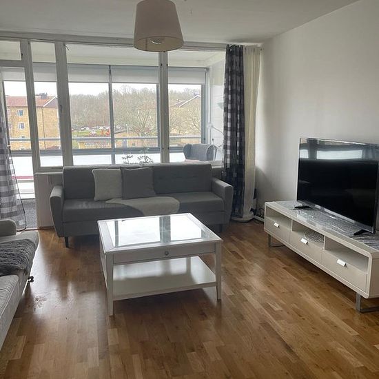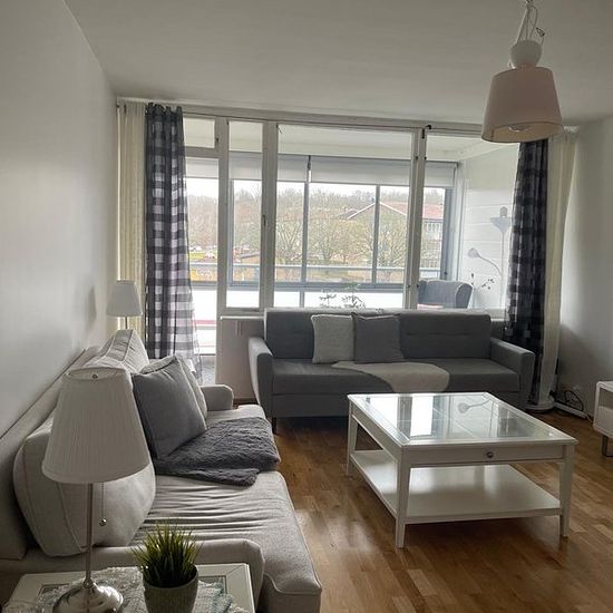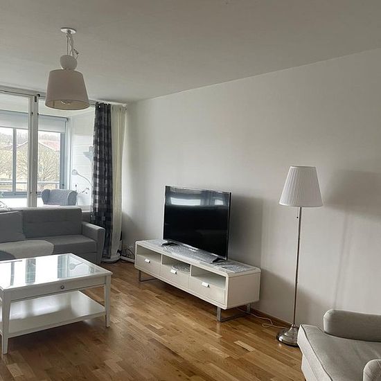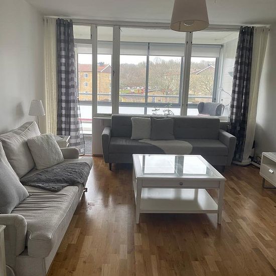 Denna moderna lägenhet på andra våningen erbjuder 76 kvm fördelat på ett rymligt vardagsrum, två sovrum, kök med matplats och ett fräscht badrum. En inglasad balkong ger extra utrymme för avkoppling året runt. Lägenheten har även tvättmaskin, torktumlare och diskmaskin för maximal bekvämlighet, samt ett praktiskt förråd och parkering. Belägen nära skola, affärer och andra bekvämligheter, är den både bekväm och centralt placerad. Serviceavgift för hyresgäst: 505