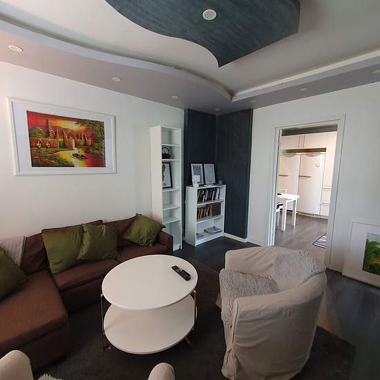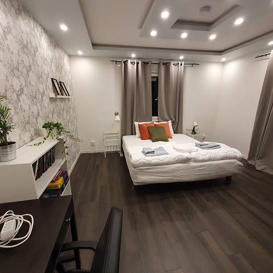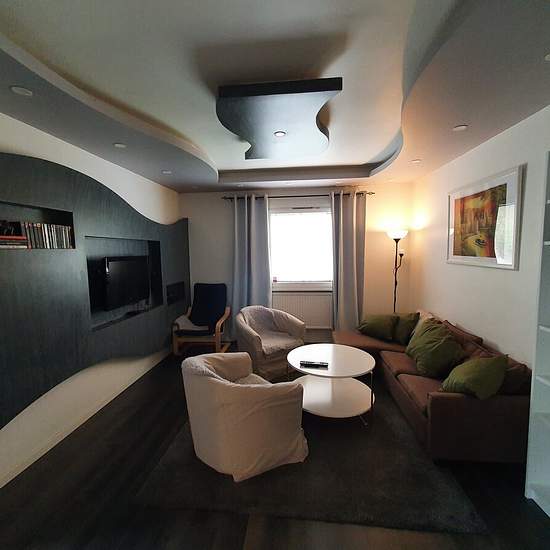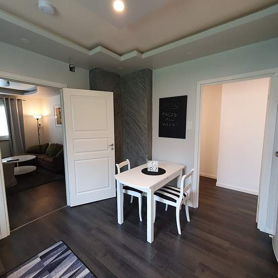 Apartment on the first floor in a quiet area with bus connections around the corner. Small grocery store and a pizzeria 100 meters away. The apartment is on the lower level in a building with a total of two apartments. Can be rented for short periods. Has been rented to a company with guest workers over the past year. Good layout. Cold rent - New heating system with low electricity consumption. Service fee for tenant: 321