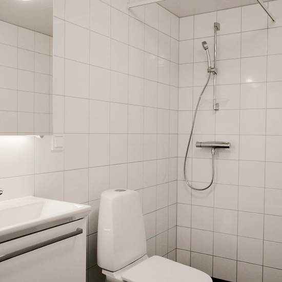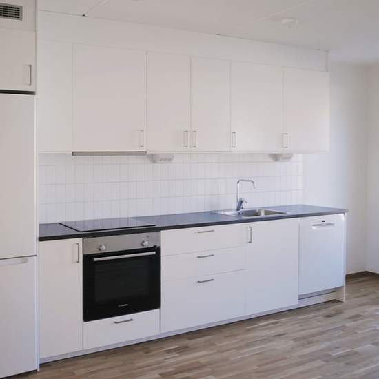 Three-room apartment with lovely spaces and an entrance from the external walkway. The hall has plenty of storage in wardrobes and a cleaning closet and leads into the kitchen and living room in a delightful open-plan layout. From here you reach the smaller bedroom, and the master bedroom is adjacent to the hall and has windows onto the walkway balcony.