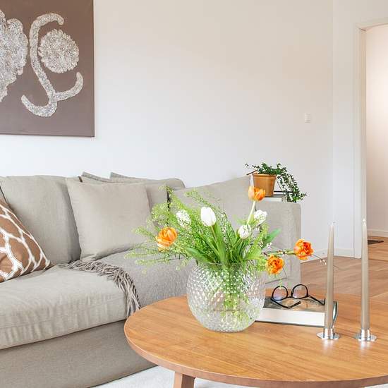 Bright three-room apartment with balcony Well-planned and bright three-room apartment located in a pleasant area. The home has white walls throughout, giving a fresh and airy impression. The kitchen is equipped with white, smooth cabinet doors and white tiles, and offers plenty of space for a dining area. The bathroom has white tiled walls and includes a bathtub. The spacious living room has white walls and parquet flooring, and from here you can access the lovely balcony. Please note that the photos in the listing are example images and...