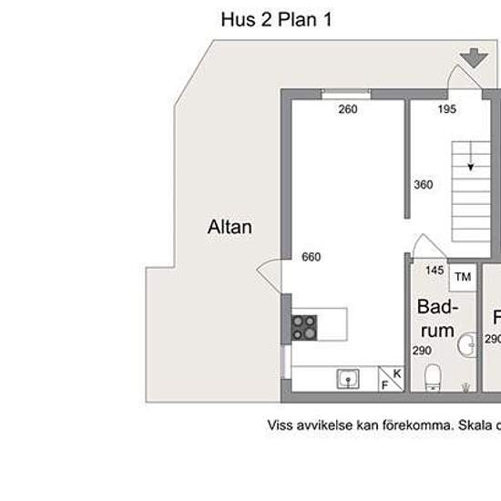 I am renting out a detached apartment located on our house lot. The dwelling is designed as a small two-story house with its own deck. On the ground floor there is an open-plan layout with a kitchen and living room. On the upper floor there are two spacious rooms that can be used as two bedrooms or as a bedroom and an office — perfect for you who work from home. The rent includes parking, hot and cold water, garbage collection and electricity. Service fee for tenant: 565