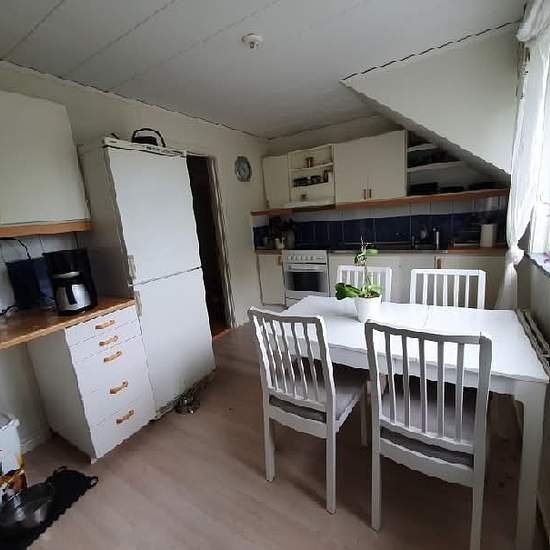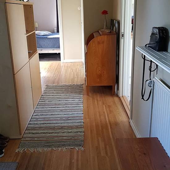 Cozy apartment in the main house of Åsa Gård. Upper floor. Quiet and rural — 3.5 km to the town and the bridge. Three cold attic spaces converted into rooms, one of which is larger and is included in the stated area. Private stairwell and patio. Bus stop at the property boundary. Service fee for tenant: 400