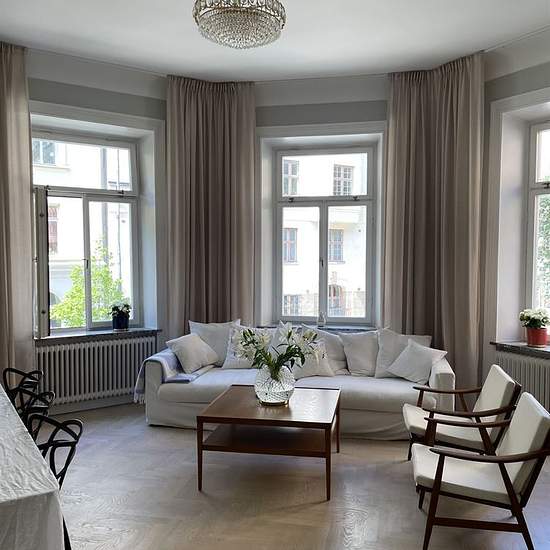 Magnificent turn-of-the-century 3-room apartment - Nybrogatan At a sought-after address right next to Karlavägen there is now an opportunity to rent this magnificent and social 3-room residence with a unique corner room featuring three large windows overlooking the quiet Tyskbagargatan and Nybrogatan. Living room with dining area: Open and airy living room with space for a large dining table and a seating area, with an open fireplace in Kolmården marble. Fantastic ceiling height of approximately 3.37 m with ornamentation including a ceilin...