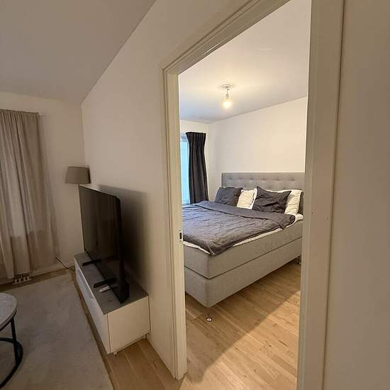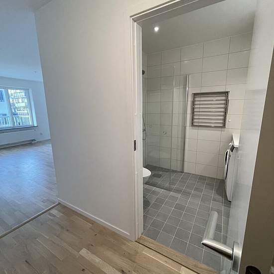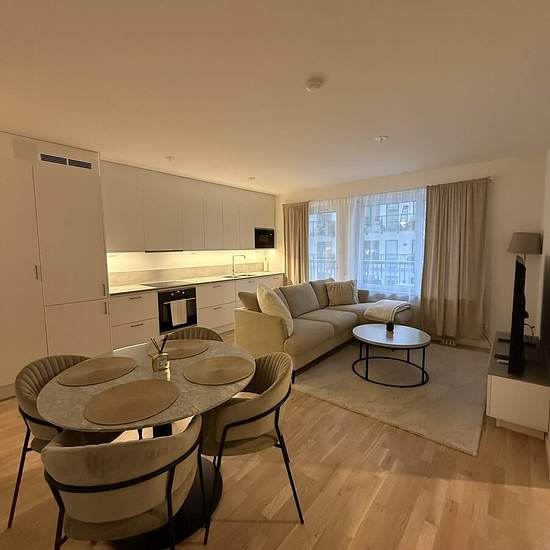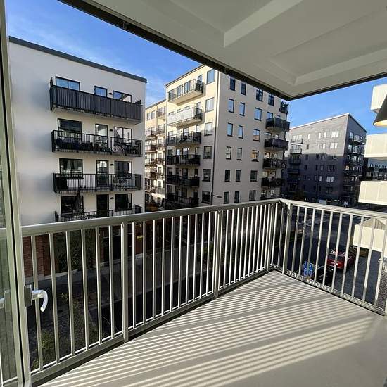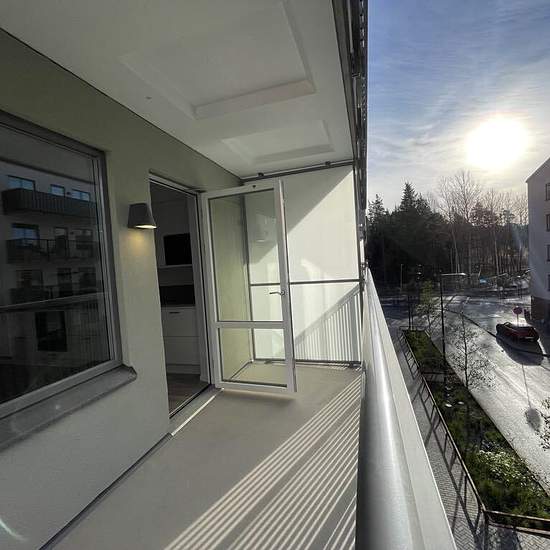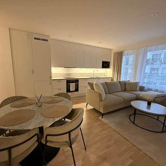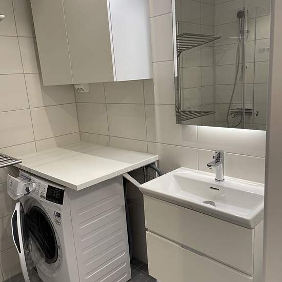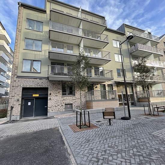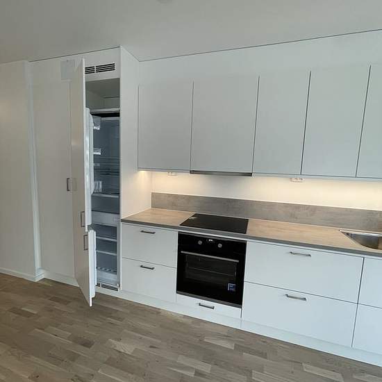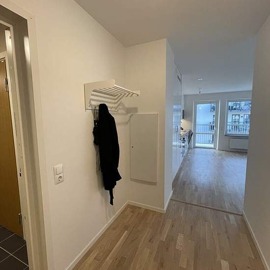 A newly built home in Täby. The apartment greets you with a sleek feel, white walls and continuous parquet flooring. The entrance is furnished with a hat shelf and a wardrobe. The bathroom is adjacent to the entrance and has white tiled walls, gray tiled floor, a shower with a screen, toilet, sink with white vanity and mirror, a drying rack, washing machine and tumble dryer with an overhead cabinet. Open plan between the kitchen and the charming living room with generous light from the large window section and access to a reasonably sized ...