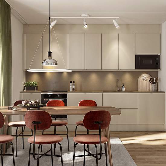 The Nordic Swan‑labelled apartments at Verket are airy and pleasant, with lightly painted walls and light oak laminate floors. The heart of the apartment, the kitchen, features cabinetry from Marbodal with smooth, sand‑coloured doors. Countertop and splashback are in laminate. Stainless‑steel appliances, an induction hob, built‑in oven, microwave in an overhead cabinet and an integrated dishwasher are included. The bathroom has grey floor tiles while the walls are clad in white tile. The bathrooms are equipped with a combined washer‑dryer. I...