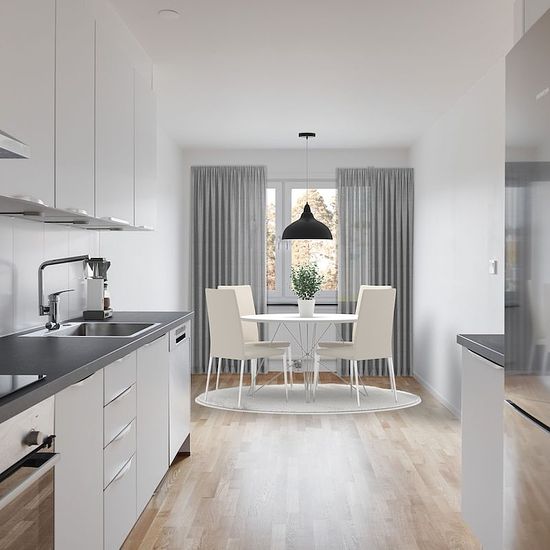 At Krongårdsvägen 11, you will live in a 3-room apartment with a kitchen, totaling 81 sqm. As soon as you step into the apartment, you are greeted by bright walls and a light parquet floor. From the hallway, you enter a large modern kitchen with white cabinets and a dark gray countertop featuring details and stainless steel appliances. Here you will find conveniences such as a built-in microwave and a dishwasher. There is space for a dining table and 4 chairs in front of the window. The apartment has two bedrooms; the large one has plenty ...