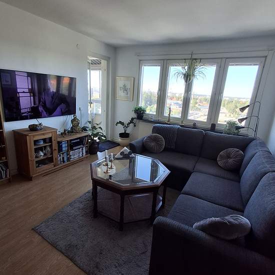 A 3-room apartment with a nice view of Västerås city from a glass-enclosed balcony. Service fee for tenant: 429