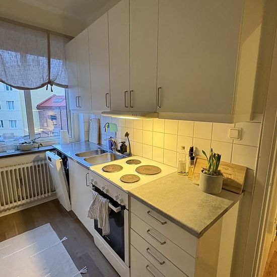 Central located three-room apartment at Karl XI:s väg 45A. Here you live close to the center and within cycling distance to both the sea and Galgberget. Fully equipped kitchen. One of the rooms has access from both the kitchen and the living room, allowing it to be used as a dining room or a bedroom. In the living room, you will find a decorative open fireplace. It is not allowed to burn fires in the open fireplace. Laundry room in the basement. Broadband via ADSL (No fiber).