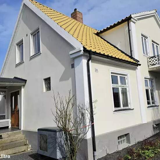 Description Lovely semi-detached house in Höganäs On Storgatan in Höganäs, opposite Tivolihuset, you will find this well-maintained classic semi-detached house of 95 m². A large, wonderful new kitchen with an island, a fireplace, and an open floor plan to the living room on the ground floor. There is also the house's bathroom with a shower and a smaller bedroom with space for two single beds. The upper floor has two spacious bedrooms equipped with quality double beds from Hästens and Carpe Diem. One of the rooms has access to a balcony, ...