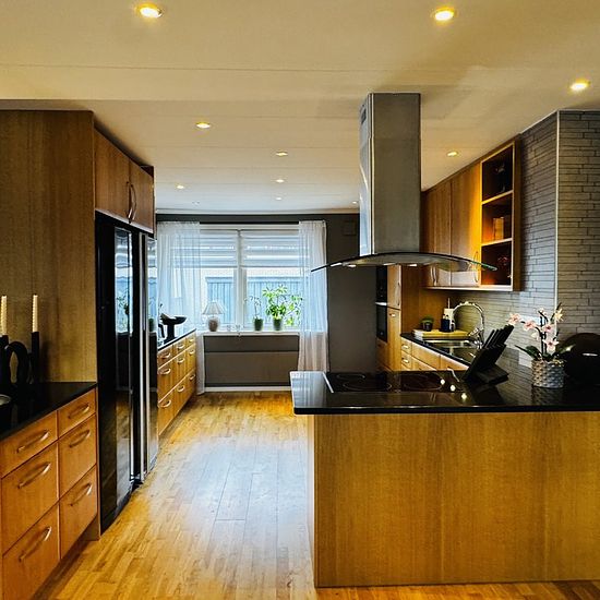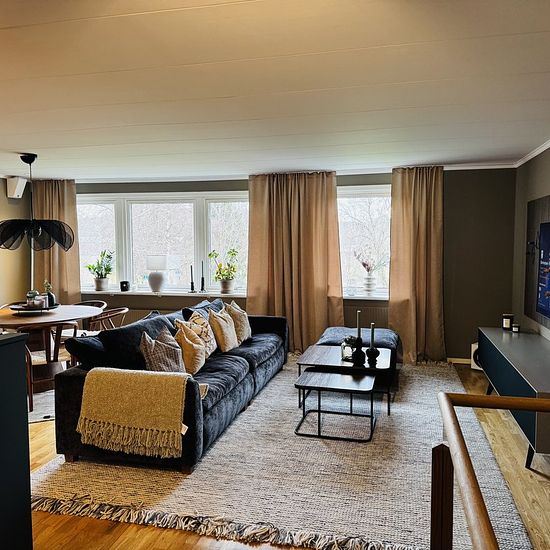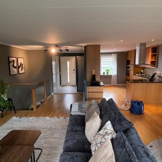 Newly renovated split-level villa in a quiet area with a patio at the front and a small garden at the back. Approx. 200 m2. Close to preschool/school, grocery store, good bus connections. About 5 minutes walking distance to the center. Service fee for tenant: 773