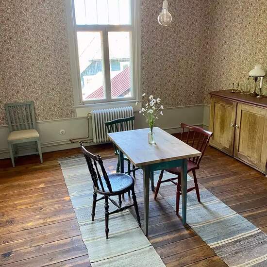 Beskrivning Egen lägenhet i villa från 1904 i två plan. Egen ingång, uteplats och parkering. Exklusivt renoverad och inredd i sekelskiftesstil. Nära centrum och kommunikationer. Utsikt mot kanalen.