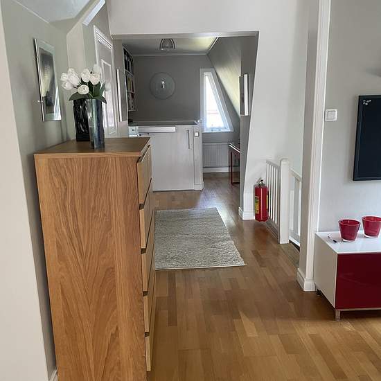 Rooms in a villa on the upper floor. The entire floor is for rent (3 bedrooms, a bathroom and a living room), alternatively the rooms can be rented individually. Large shared kitchen. Access to a separate building with a sauna, shower and workshop. 1 minute to Näset bus stop, where buses run frequently to Slussen. Service fee for tenant: 627